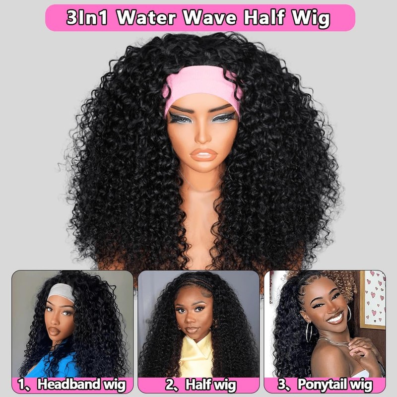 OWNROSE Water Wave Half Wig Human Hair 200% Density Glueless Wigs Human Hair 3 In 1 Curly Half Wig Flip Over with Adjustable String Invisilbe Hairline Beginner Friendly Headband Wig 16 Inch
