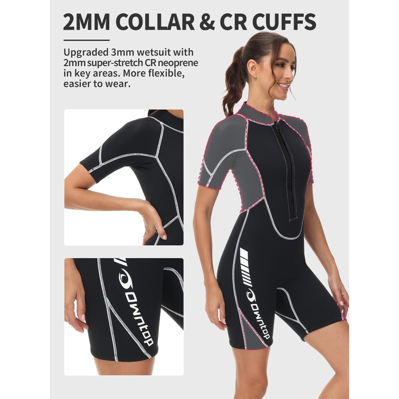 - UPGRADED PREMIUM 3/2MM WETSUITS: Owntop 3mm shorty wetsuits enhanced with a 2mm super-stretch CR neoprene on the neck, arms, and leg cuffs for unrestricted motion, warmth and flexibility.