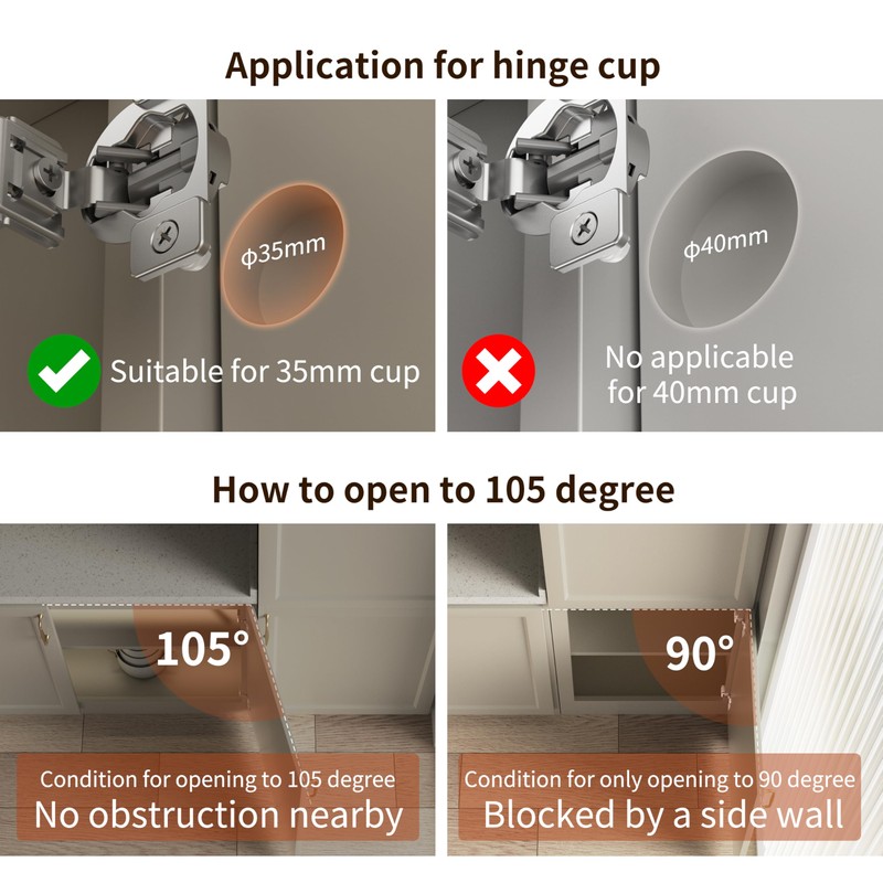 • Package Content: 6 pcs 1-1/4" overlay soft close hinges with installation screws. 105 degrees opening angle, 35mm cup size , screw holes distance is 45mm and 11.3mm cup depth for the most common cupboard cabinet door styles.