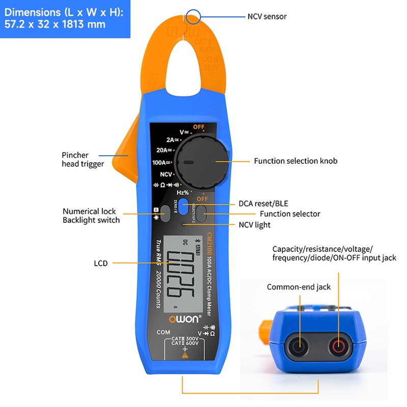 OWON CM2100 Mini Digital Clamp Meter 20000 Counts Handheld True RMS AC/DC Current and Voltage Test with VFC Overload Protection Resistance Capacitance Tester, 600V 100A NCV