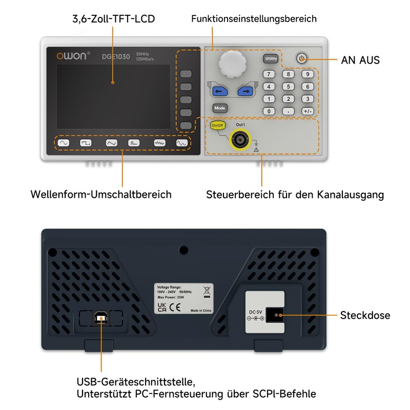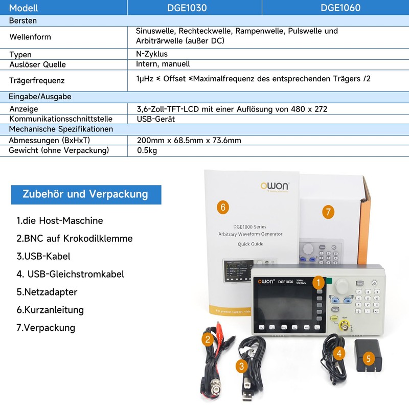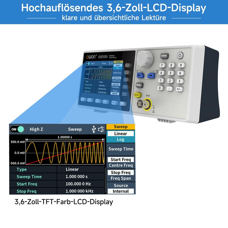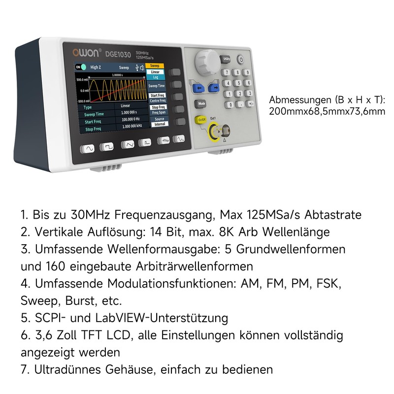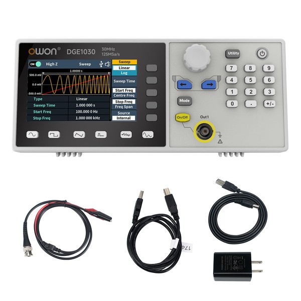OWON Waveform Generator,30MHz Bandwidth, 125MSa/s Sampling Rate, 14 bits Vertical Resolution, 8K Waveform Length,5 Basic Waveforms, and 160 built-in Arbitrary Waveforms, with 3.6IN LCD Display DGE1030
