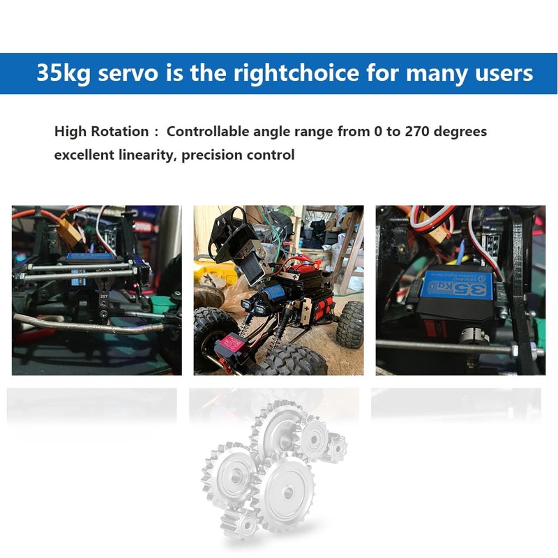 - High Touque Metal Gear 35kg servo motor for DIY work such as rc car handle, aircrafts models,car models,ship models,mechanical arms,intelligent robots etc with ease. Really easy install and really powerful on.