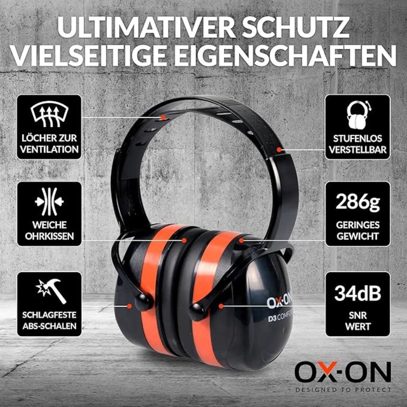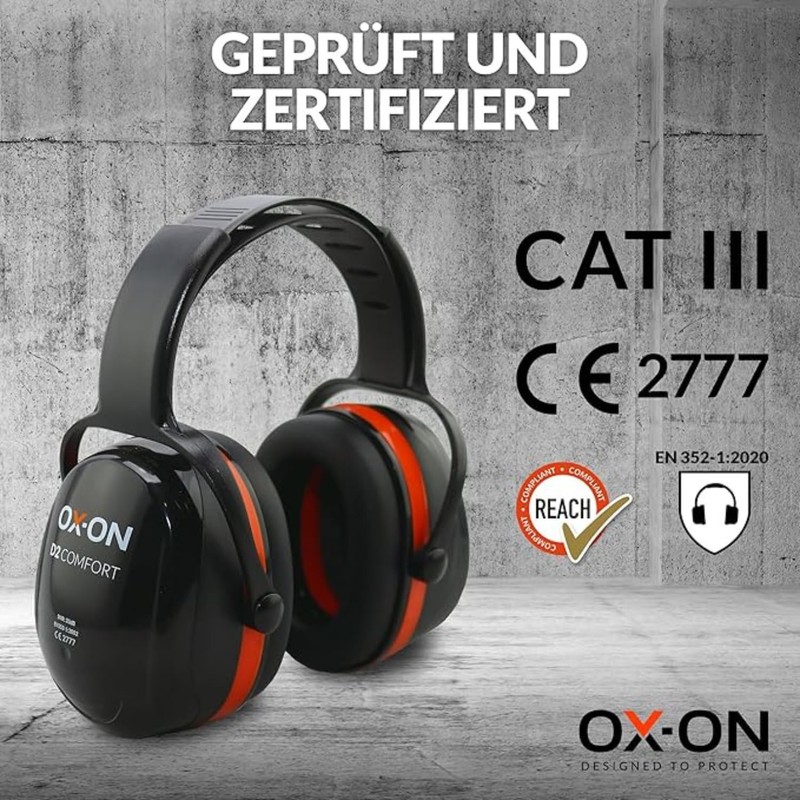 • Highest protection against extreme noise loads – the OX-ON D3 Comfort ear protection offers excellent noise reduction with an SNR value of 34 dB, ideal for use in extremely noisy environments. The soft, tight-fitting ear pads ensure a comfortable feel and maximum protection.