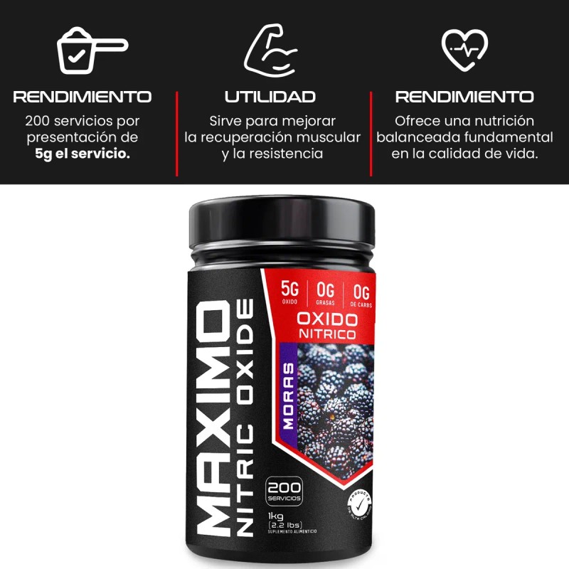 Óxido Nítrico Maximo Protein Pre Entreno 1kg 200 Servicios Moras