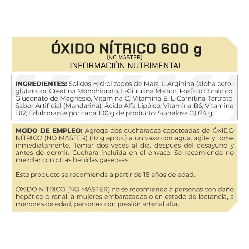 Agregar dos cucharadas copeteadas de OXIDONITRICO (NO MASTER) (10g aprox.) a un vaso con agua, agite y tome inmediatamente. Tomar dos veces al día, después del desayuno y antes de dormir. Cuchara incluida en el envase. Se recomienda no mezclar con otras bebidas gaseosas.
