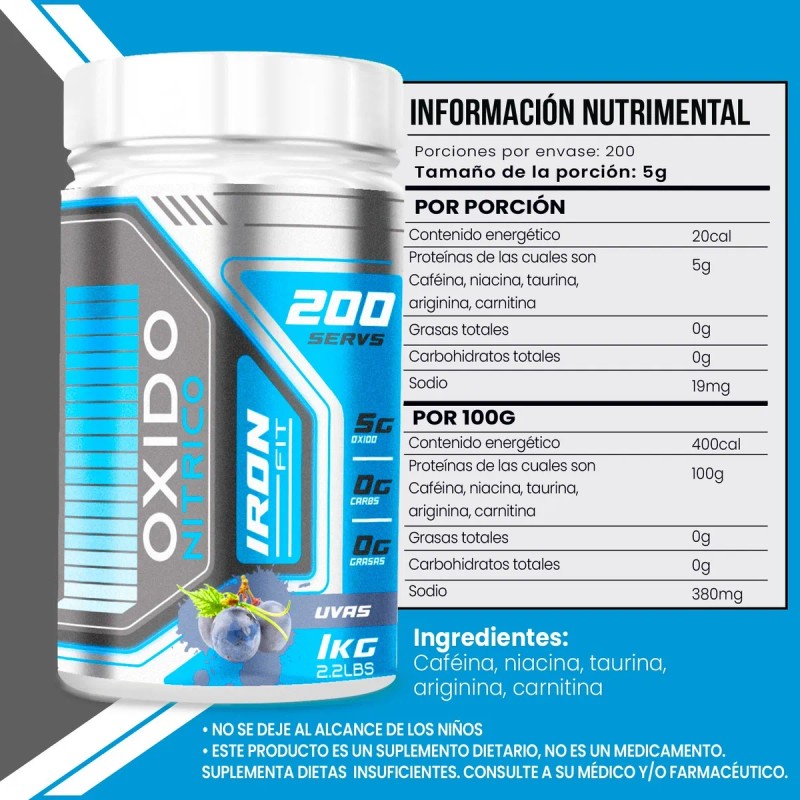 Óxido Nítrico Polvo Iron Fit 1kg Pre Entreno 200 Servicios Uva