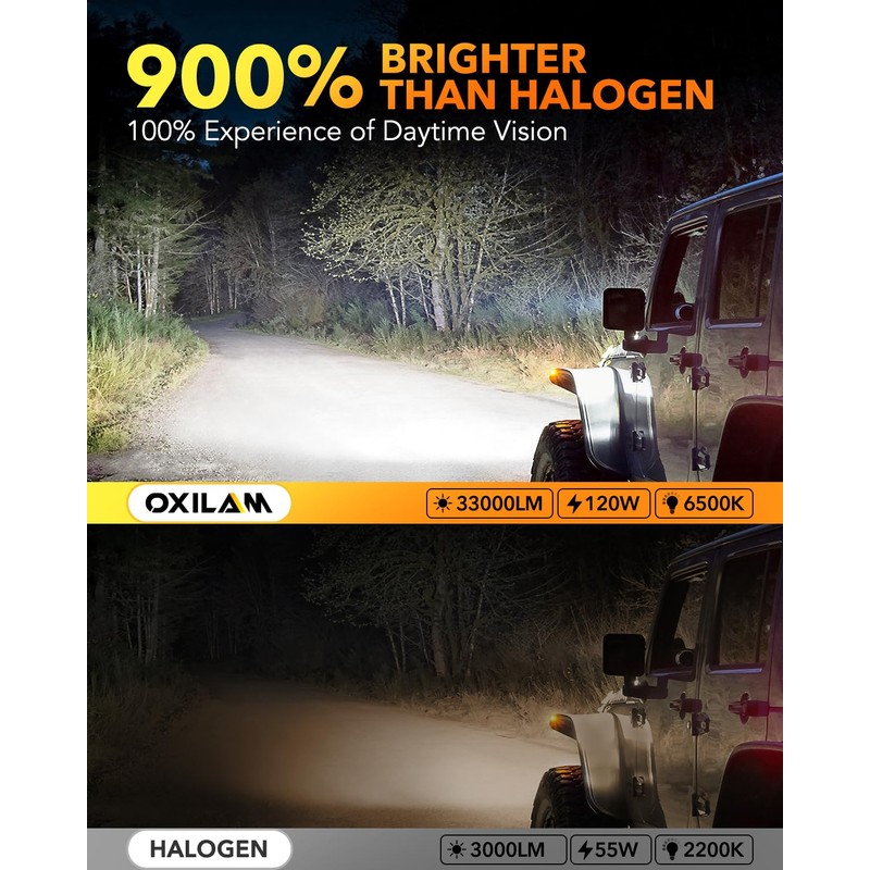 - 【900% BREAKTHROUGH BRIGHTNESS】It is time to upgrade your driving experience with OXILAM‘s high-power bulbs, featuring 32 high-power chips per light and an impressive 33,000LM brightness. 6500K cool white bulbs make the road clearer at night and enjoy safe night driving on unlit and remote roads.