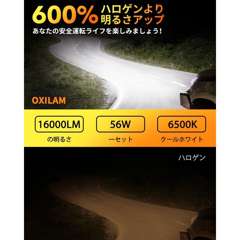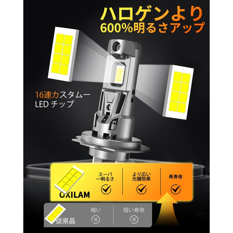 - 6x Brightness & Compatible with New Standard Car Inspection: The OXILAM h7 LED headlight has been upgraded to 16 lamp beads and is the latest automotive lighting technology. Compared to traditional single row, this upgrade has a dual light source for greater visibility and a wider and more uniform irradiation. Equipped with 16 ultra-bright chips, 6,500K cool white, approximately 6 times brighter than genuine halogen bulbs. Improves visibility of road and sidewalk obstacles for greater distance, and improves visibility at night. The body has a luxurious plating finish which greatly improves stealth when turned off. [Keep your car sharp and stylish! The shape of the irradiation may vary depending on the vehicle side reflectors as it is a generic product. In addition, there may be differences in the standards of inspection personnel depending on the location. )!!
