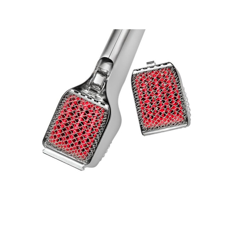 - Metal scraper with cut-outs designed for deep cleaning all types of grill grates (except ceramic-coated)