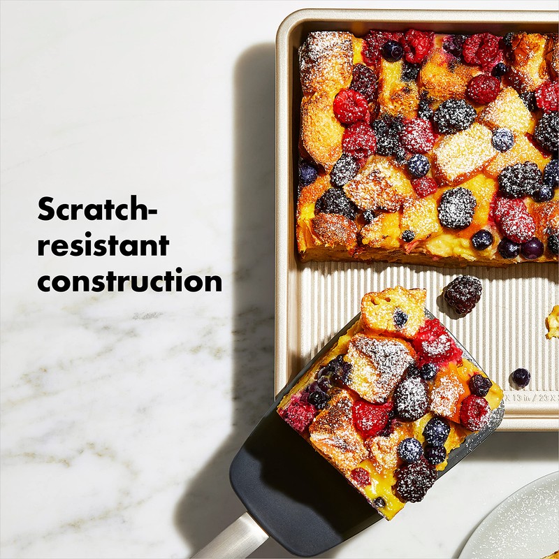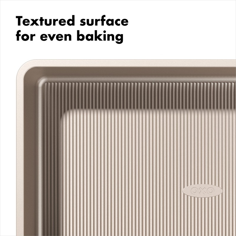 OXO Good Grips Bakeware combines precise engineering with all the thoughtful touches that go into OXO products. Nonstick Pro Bakeware is made from durable, heavy grade aluminized steel that promotes even heat distribution. Each piece features a commercial grade, double layer, ceramic-reinforced PTFE coating that protects against scratching, staining, corrosion and abrasion. This dual function coating is ideal for both savory and sweet treats. The Non Stick line also utilizes a micro textured pattern to promote airflow and minimize surface contact for even baking. All OXO Good Grips Nonstick Pro Bakeware pieces feature square rolled edges for a secure grip, and are dishwasher safe.