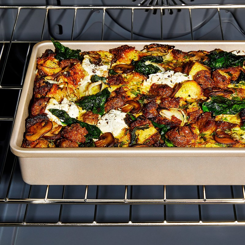 - Square rolled edges add strength and offer a secure grip for easy transfer to and from oven