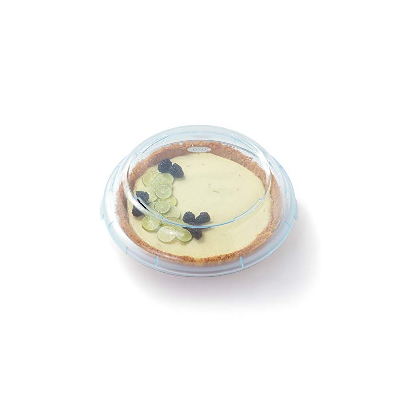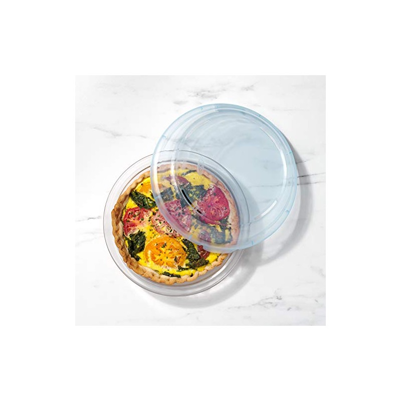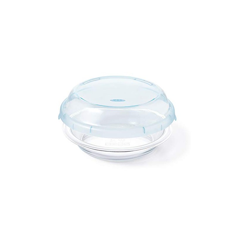 The OXO Good Grips Covered Pie Dish is made of borosilicate glass to allow transferring from oven or microwave to freezer. Comes complete with a translucent, BPA-free lid to help protect contents and prevent spilling when storing or on-the-go.