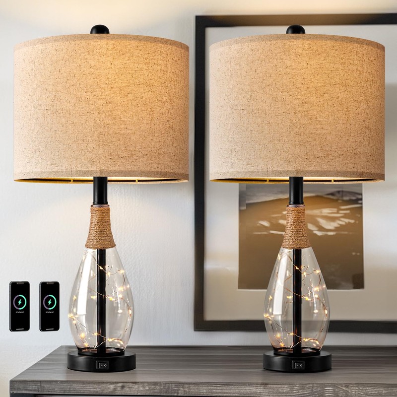 - Perfect Bedroom Decor: Bedside Lamps for night stands set of 2 has Unique glass table lamps, linen fabric lampshades and high-quality resin wood lamp holders add a romantic and warm atmosphere to your living room, rattan wrapped design on the modern table lamp holder and the glass lamp body of the drip-shaped built-in nightlight make the lamp even more unique. Not only can it be used as a modern nightstand lamp, but it can also be used as a boho lamp, suitable for boho decor and farmhouse decor.