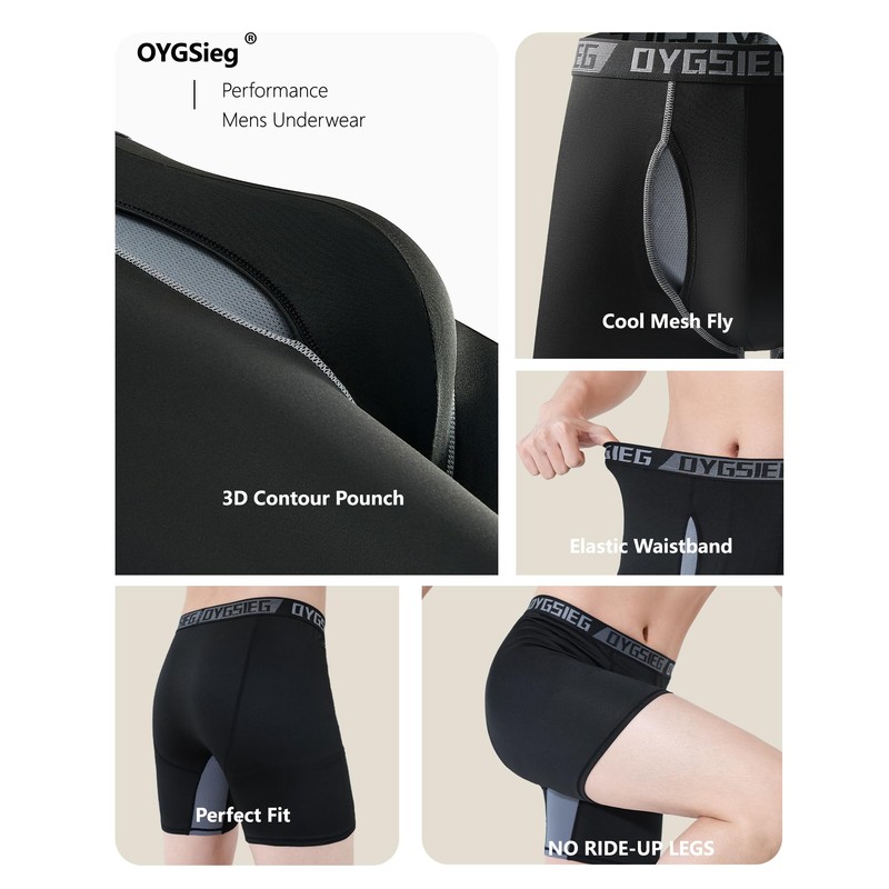 OYGSieg Men's Boxer Briefs 5-Pack​ Stay comfortable and cool all day with these performance-driven boxer briefs designed for everyday wear.​ Premium Comfort & Value​ Crafted from silky-soft, skin-cooling fabric, these briefs offer all-day freshness and premium quality at an excellent value—perfect for daily use.​ Anti-Chafing Support​ The built-in Total Support Pouch with breathable mesh liner and separating design reduces friction, providing stable support and long-lasting comfort.​ Cool & Dry Technology​ Targeted mesh panels enhance breathability, while moisture-wicking fabric and odor control keep you fresh and dry through any activity.​ Move Freely​ 4-way stretch fabric and flat seams ensure unrestricted movement, making them ideal for workouts or all-day wear.​ Great Gift Idea​ A 5-pack of versatile, breathable briefs in classic styles—perfect for gifting on birthdays, holidays, or any occasion for the men in your life.