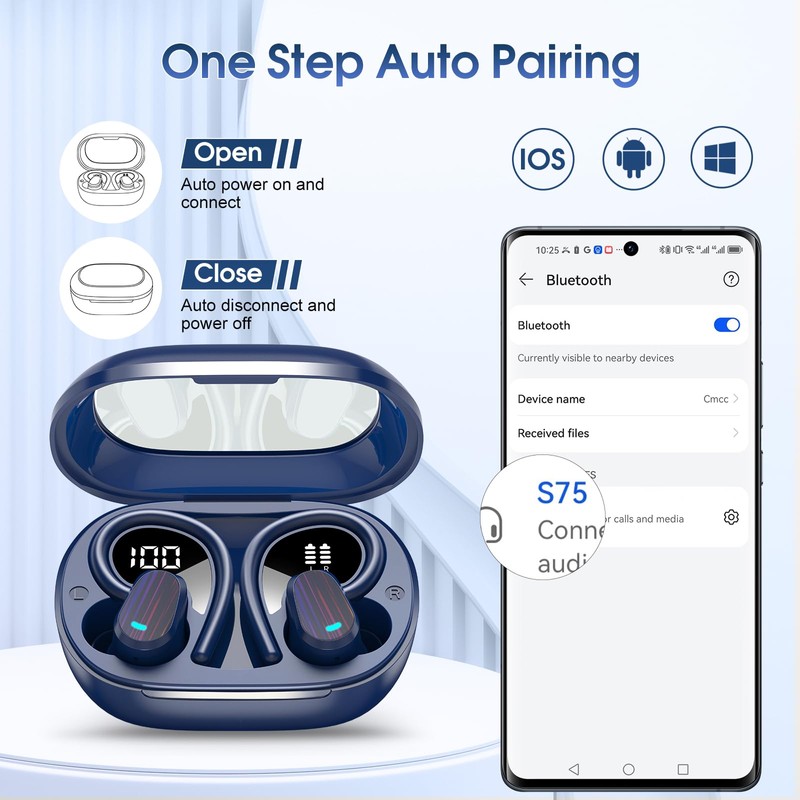 • Advanced Bluetooth 5.4 and Auto Connection: Wireless earbuds sport adopt advanced bluetooth 5.4 technology. Use wireless headphones you will get 3x faster transmission speed than before, more stable connectivity, lower power consumption and ultra-low latency listening experience. Open the lid of the charging case, the bluetooth earbuds can be automatically connected to the previous paired device, and ensures a strong, continuous connection within a range of up to 15m from the paired device.