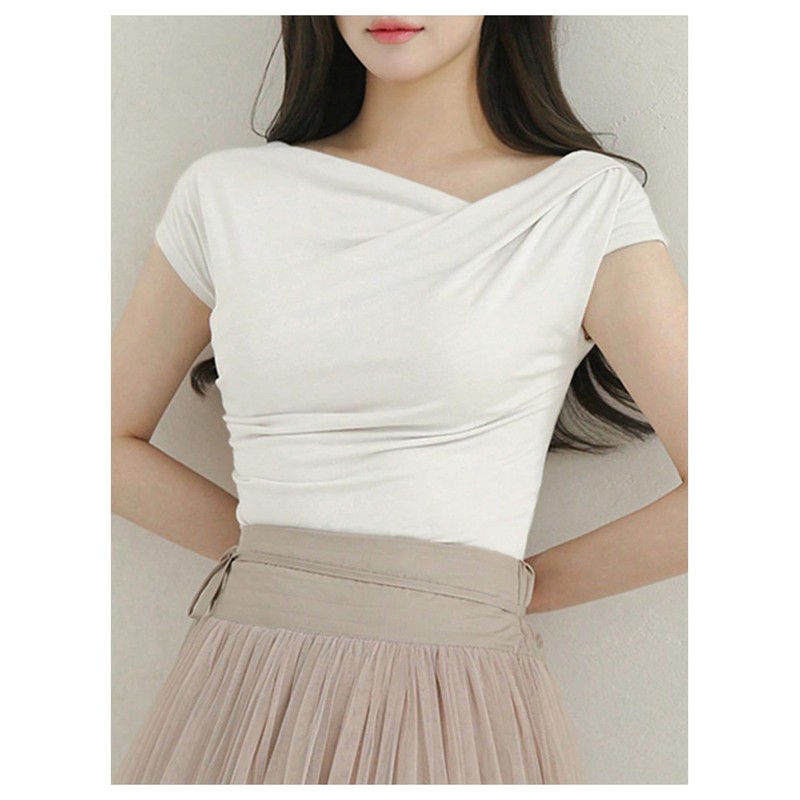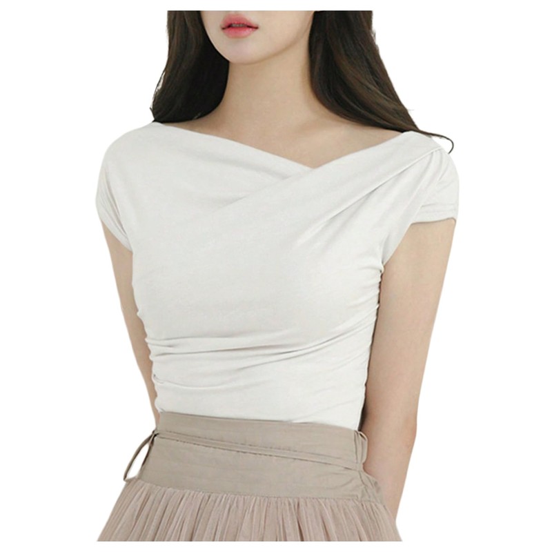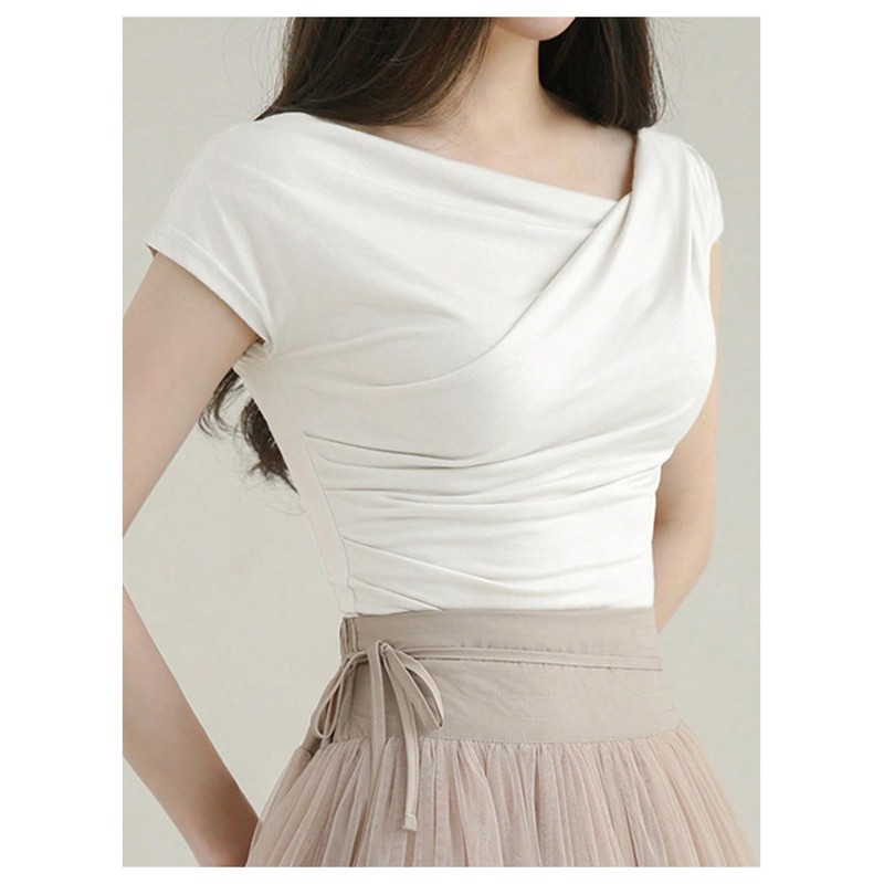 - Features: Short sleeve, asymmetrical neck, ruched, slim fitted, ruched top, going out tops