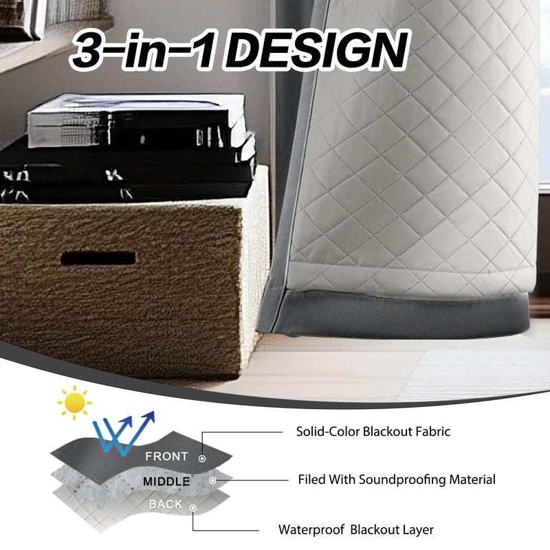- 3-layer design: The front is made of solid-color simulated silk blackout fabric, the middle layer is filled with soundproofing material, and the back is a waterproof reinforced blackout layer, which can achieve full blackout, sound insulation, noise reduction, heat insulation, and cold resistance. It can also be used as a space partition and door curtain.