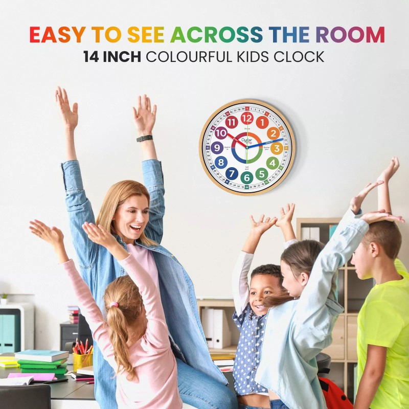 - Designed by Teachers and Parents Our big 14" learning time clock has all the information you need to teach time - minutes hands and quarters are labelled making it easy for kids to understand