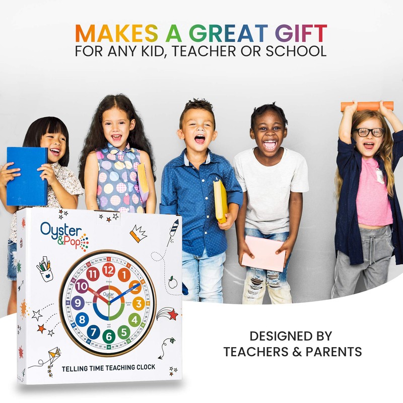 Oyster&Pop Learning Clock for Kids - Silent Telling The Time Teaching Clocks - Non-Ticking Kids Clocks for Bedrooms - Classroom Clocks for Teaching Time - Kids Learn to Tell Time Easily