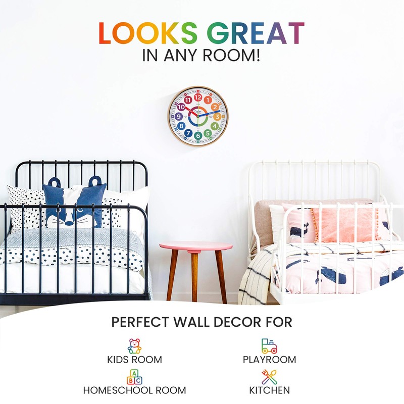 With a stylish wood effect frame and versatile colors it makes great kids wall decor - for kids bedroom, childrens playroom, homeschool room or nursery. Kids learning clock for any preschool or school classroom - essential teaching supplies for any teacher. Both boys and girls love the bright non ticking practice clock making reading analog time a fun part of each day.