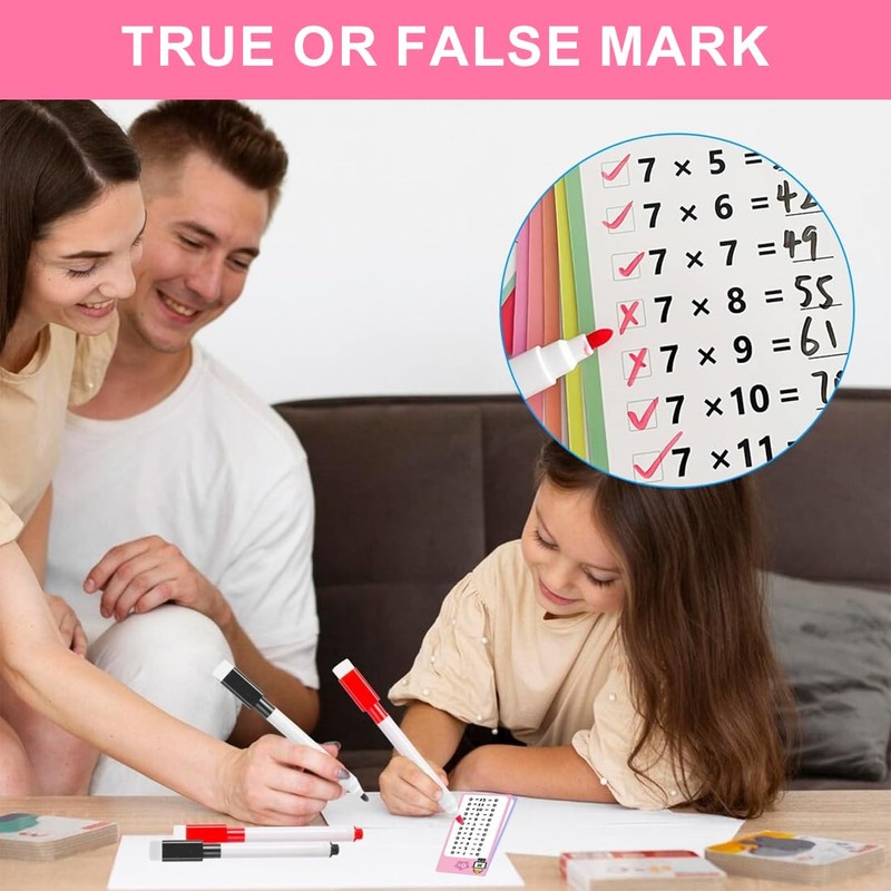 Easy to Use The multiplication table is printed on two sides, one side is the question and the other side is the answer. Equipped with two-tone pens, it is convenient for children to check and rate their own answers after answering the questions. Simply wipe the answer with a paper towel so it can be easily changed and reused later.