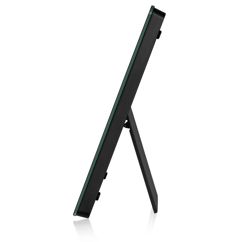 - Boasts an ultra-modern design with a large (7” x 9”) glass weighing platform, wall-mount notches and a retractable kickstand for easy storage.
