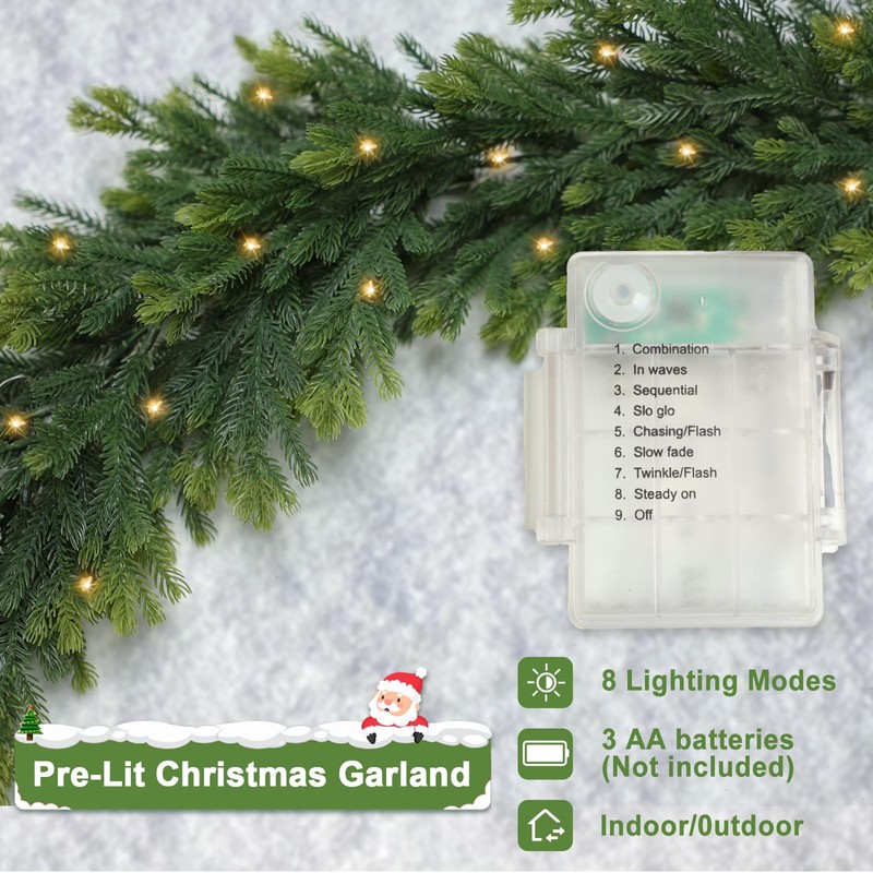 - Christmas Garland with Lights:6-foot Christmas garland decoration is made of dark green and lights strings, Christmas Garland with Lights: Outdoor garland LED light string contains 8 gears (1. Combination 2. Wave 3. Sequential 4. Slow light 5. Chasing/Flash 6. Slowly fade 7. Twinkle/Flash 8. Steady on 9. Off) No plug required, the LED light string is powered by 3 AA batteries (batteries not included).