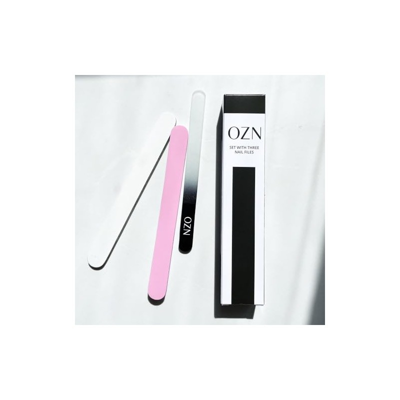File set consisting of three nail files: a professional file with two sides for trimming and shaping nails. A glass file for sealing nails. A buffing file with two sides for smoothing and polishing nails.