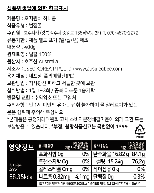- 원(재)료명 및 함량: 천연 벌집꿀 100%