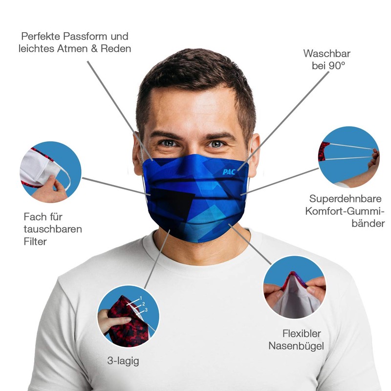 P.A.C. Premium Community Mask + Pack of 5 Activated Carbon Filters, Mouth & Nose Mask, Everyday Face Covering, with Activated Carbon Filter, Washable up to 90°, Nose Clip and Filter Bag, Reusable - Pleya + filter.