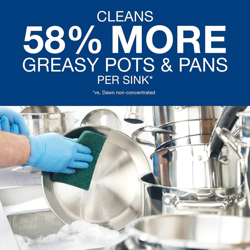 - Dawn Professional dishwashing detergent with long-lasting suds cleans 58percent more greasy pots and pans per sink (vs. Dawn non-concentrated)