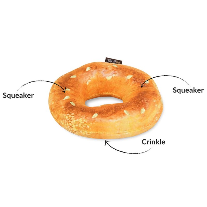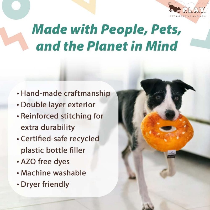 P.L.A.Y. Cute Plush Dog Toys - P.L.A.Y. Montreal Munchies Food Themed Durable Squeaker Toy, Great for Puppies & Small, Medium, Large Dogs - Machine Washable, Recycled Materials (Bagel)