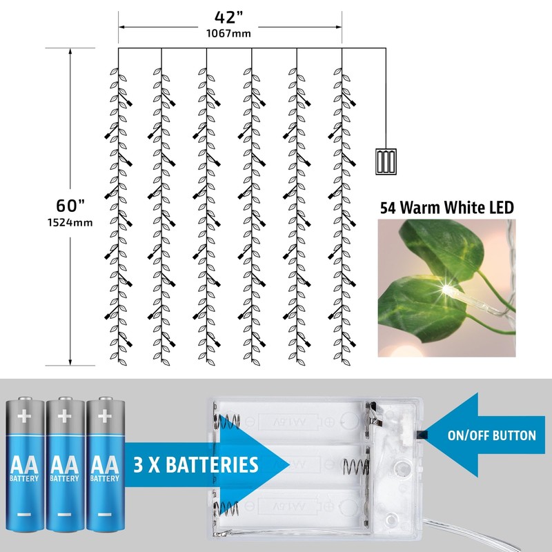 P L-RA LED Cascading Curtain Vine Indoor Lights, Warm White, 3.5ft W X 5ft H - Easily Hang These Vines Against Any Wall Or Curtain to Set Up, No Wires Needed Thanks to A Battery-Operated Design