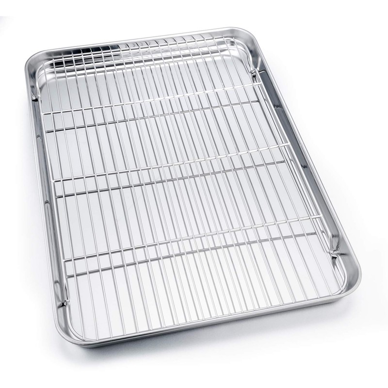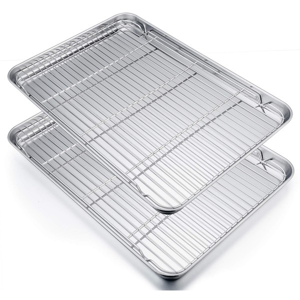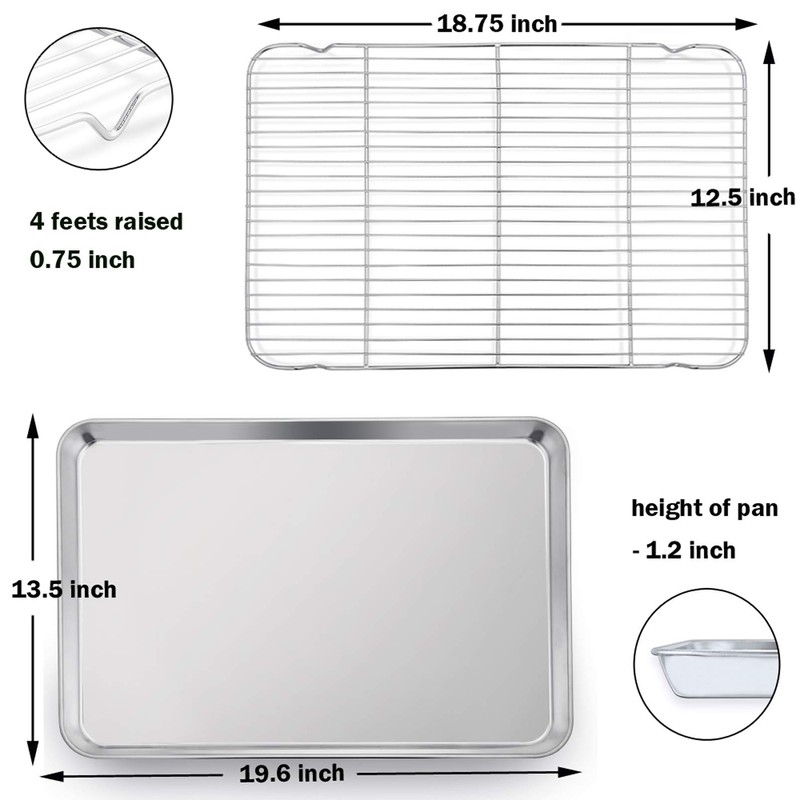 - 【EXPERTLY DESIGNED】The stainless steel baking pan has mirror finish polished, always keep a smooth and shiny surface, Rolled edges with no sharp spot, The wire rack with dense parallel lines to keep food from falling through