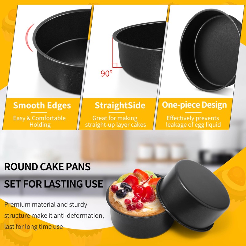 - STURDY STEEL COREThe round cake pans are constructed by heavy-gauge stainless steel core, To avoid deformation and warp resistance, Good heat conduction to spread the heat evenly and quickly, Easy to shape of the cake, Compared to other metal or aluminium core pans, They are rust-free and could be durable for a long service life, Oven, air fryer, pot and freezer safe