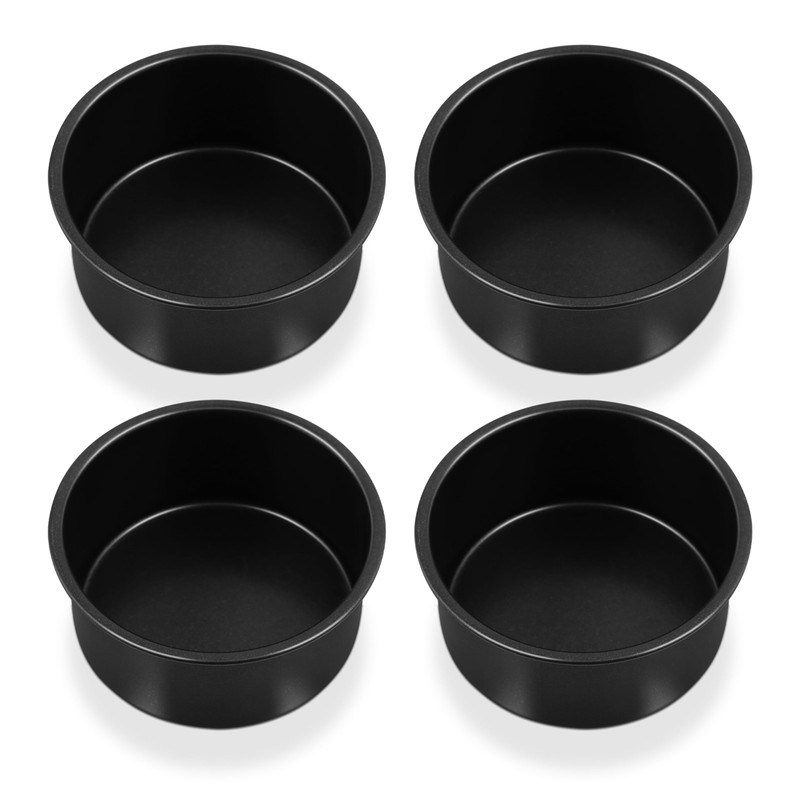 - 4 INCH - SET OF 4This set includes 4 same-sized mini cake pans (4 diameter x 2 height), 4-pieces could help you to bake more mini chiffon cakes at the same time, Suitable for making tiered cakes, 4-inch size is great for making individual dessert or cakes for 1 person, Not only ideal to bake chocolate cake, cheese cake, mousse etc, But also as a container for serving fruits, snacks and nuts, or steaming small portion food