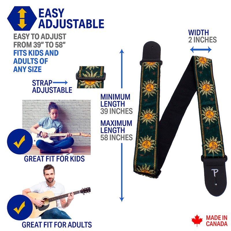 - Ajustable y cómodo: quita una carga de tus hombros y cuello con la correa de guitarra jacquard ajustable de 2 pulgadas de ancho que proporciona distribución de peso para tu comodidad. Longitud ajustable de 39 a 58 pulgadas de largo.