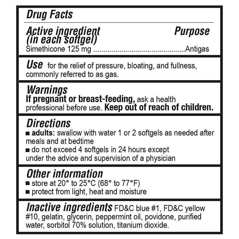 - Simeticona 125mg softgel proporciona un rápido alivio de gases y hinchazón.