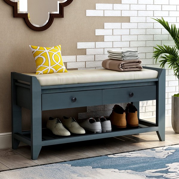 P PURLOVE Storage Bench Multipurpose Entryway Bench Shoe Rack with Cushioned Seat, Drawers and Shelf for Entryway Living Room, Antique Navy