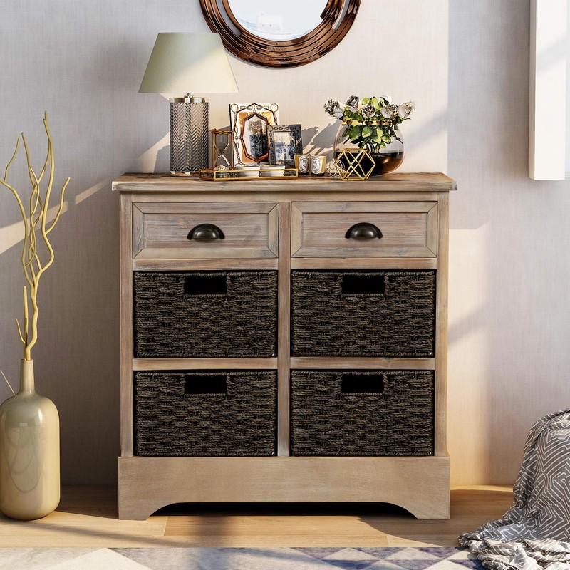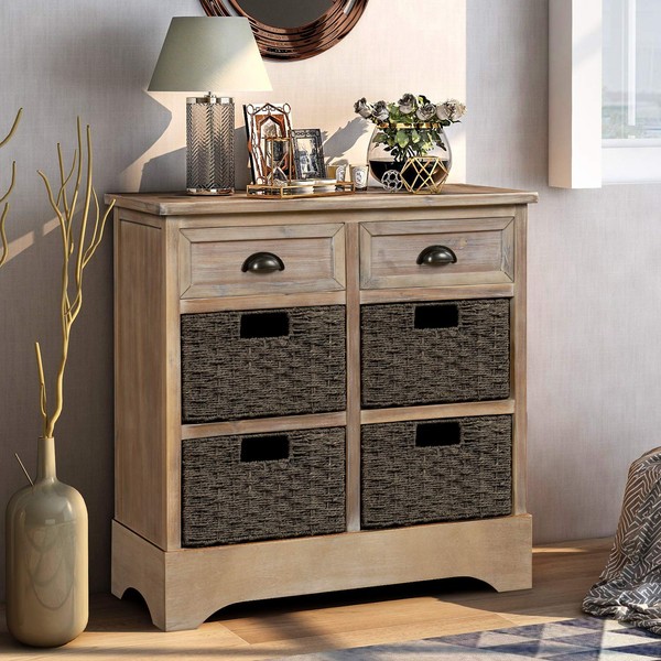P PURLOVE Storage Chest Retro Style Storage Cabinet Storage Unit with 2 Wood Drawers and 4 Wicker Baskets for Home Kitchen Entryway Living Room (White Washed)