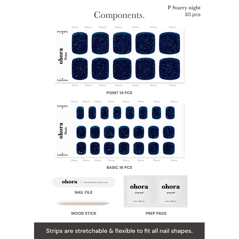 [P Starry Night] Real Gel Nail Strip by ohora - 30pcs with Prep pad, Mini Nail File, Wood Stick, DIY Toe Nail Art Starter Kit, No Glue, Non Soak-Off