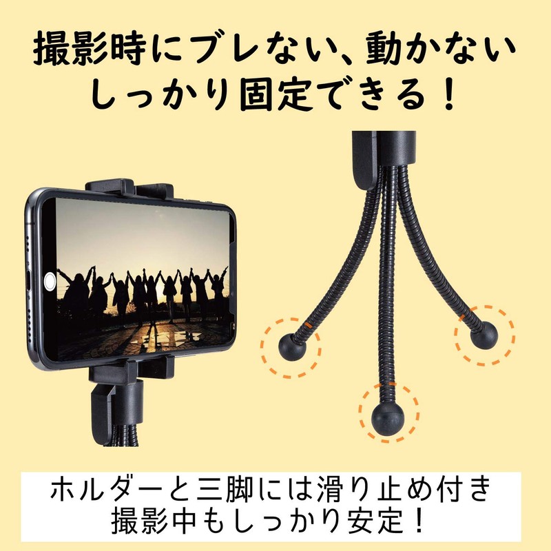 - A smartphone tripod with a flexible arm on the legs that can be bent and stretched freely