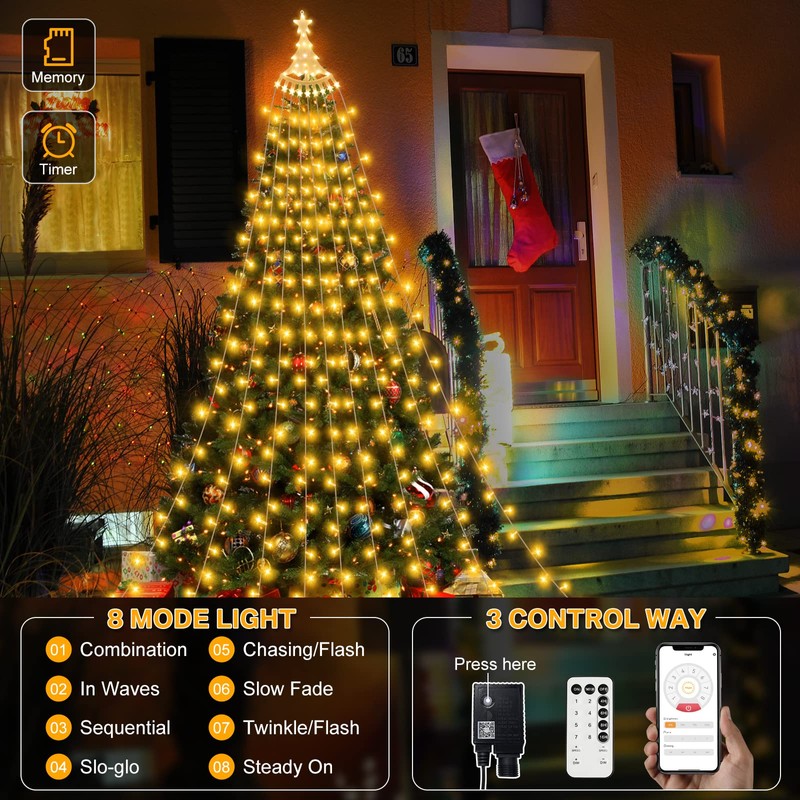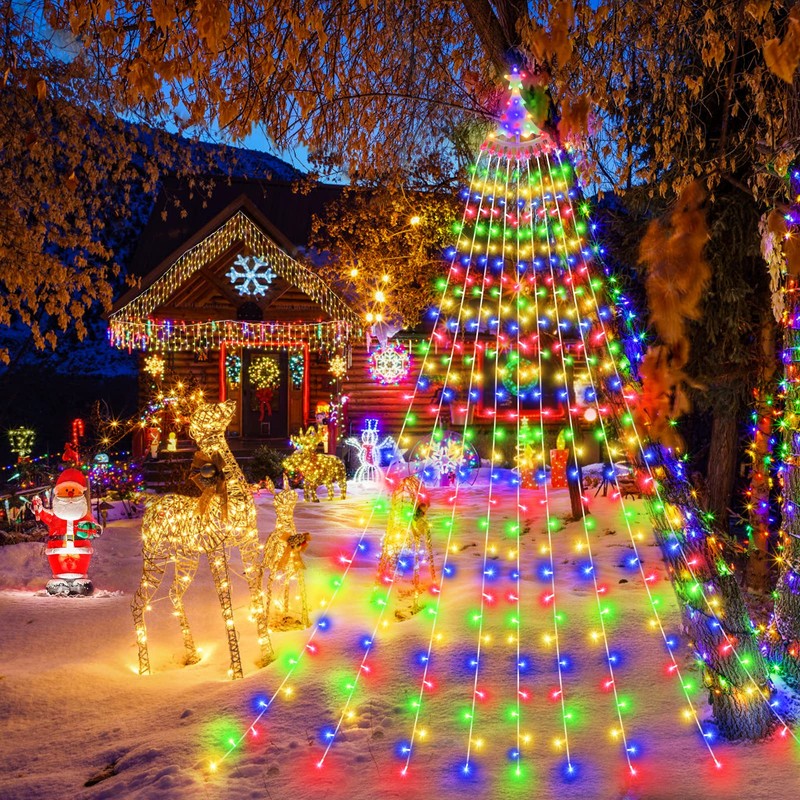 - 【Waterfall Tree Lights】Outdoor decorations waterfall lights are very suitable for decorating your tree!Just hang the stars at the top of the tree, and connect 9 string star lights as needed. It will fall to the ground according to the shape of the tree.
