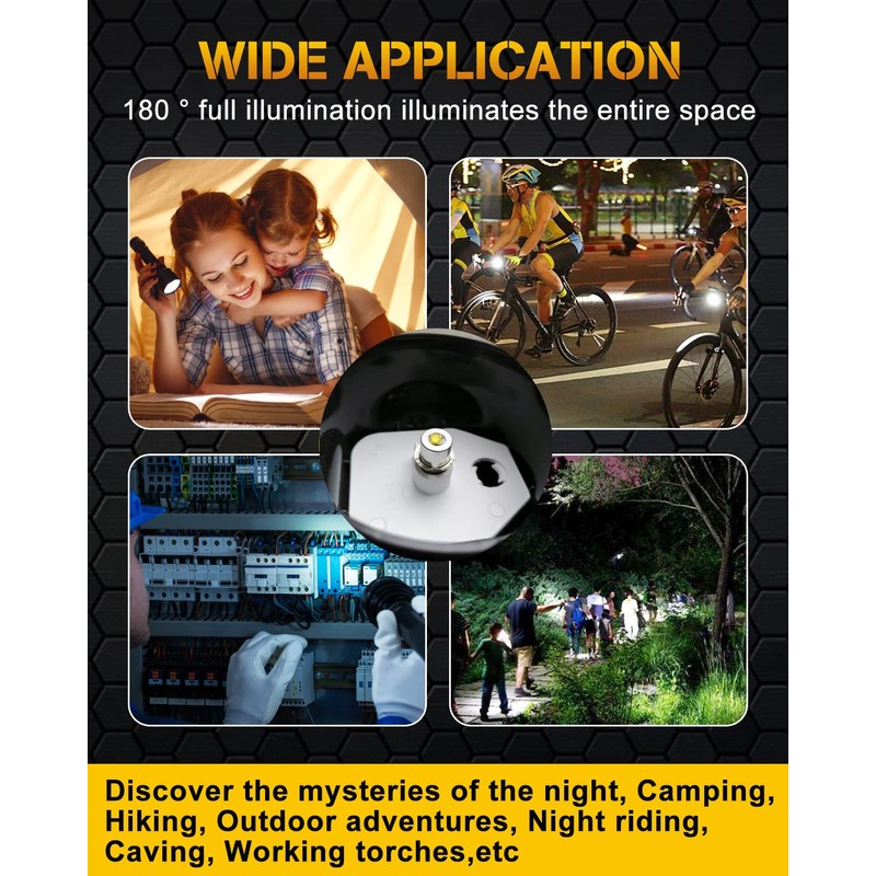 - `Discover the mysteries of the night: Outdoor adventures, Night riding, Camping, Hiking, Caving, Flashlights and more. Super invincible bright, giving you enough vision to ensure your safety.