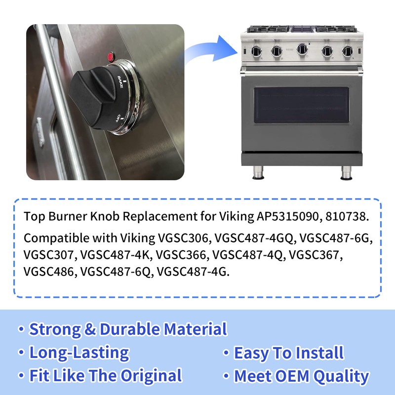 - 【High Compatibility】The PA010080 top burner selector knob is fully compatible with some Viking ranges. It can replace AP5315090, 810738 and is compatible with the following models: VGSC306, VGSC487-4GQ, VGSC487-6G, VGSC307, VGSC487-4K, VGSC366, VGSC487-4Q, VGSC367, VGSC486, VGSC487-6Q, VGSC487-4G.