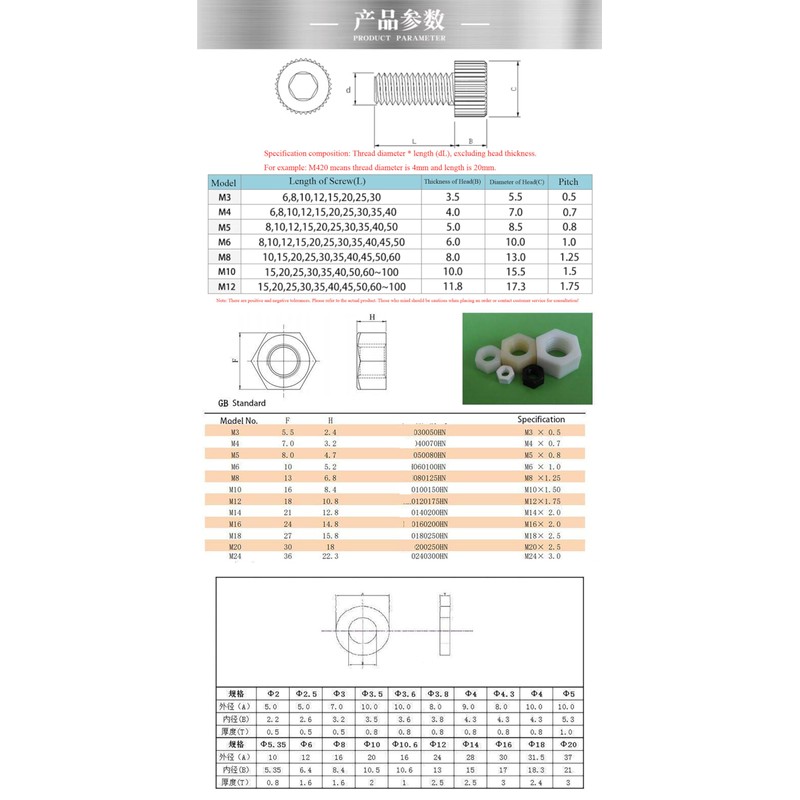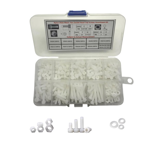 - Total 350pcs nylon white color plastic metric Hex Socket Head Cap screws,hex nut and plain washers of M3 ,it included: M3X4/30PCS,M3X5/30PCS,M3X6/30PCS,M3X8/30PCS,M3X10/30PCS,M3X12/30PCS,M3X15/30PCS, M3X20/20PCS, M3X25/20PCS,Hex Nut M3/50PCS, Plain Washer M3/50PCS