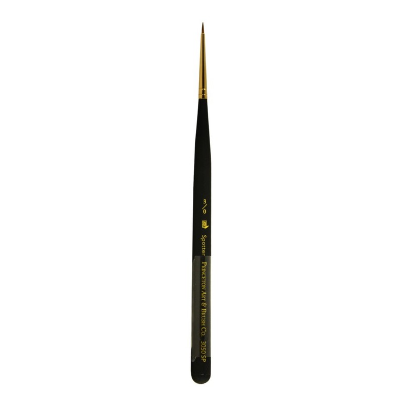 This Mini Synthetic Sable Spotter Size 000 miniature brush from Princeton's 3050 Series is essential for completing fine detail paintings and precise tasks. A favorite of decorative and miniature artists, these brushes offer a unique non-slip comfort control handle and synthetic sable blend for better brush-ability and color holding capacity.