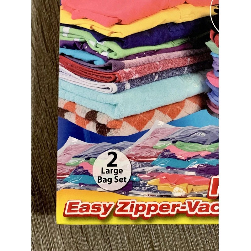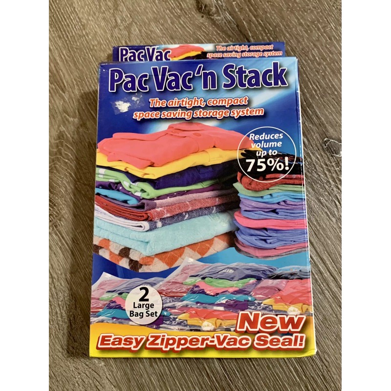 PAC VAC'N STACK Airtight Compact Space Saving Storage 2-Large Bag Set New In Box. This is a brand new box of PAC VAC Airtight Space saving storage bags size Large comes 2-Bags inside the box with new easy zip closure will ship first class mail same day handling brand new