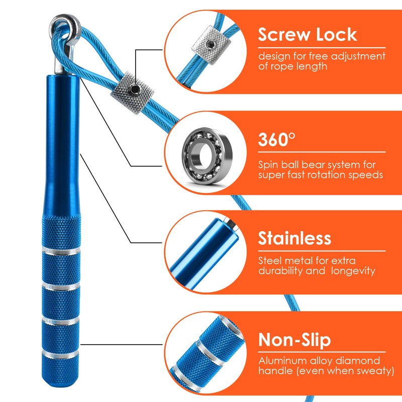 - 💪Steel Ball Bearings For Speed - Our speed rope weighted just enough to feel the rope spin, giving you more control. Plus unique, spherical ball bearing design allows rope to spin more freely and smoothly, reducing friction and increasing speed which brings you desirable double unders and high speed skipping.