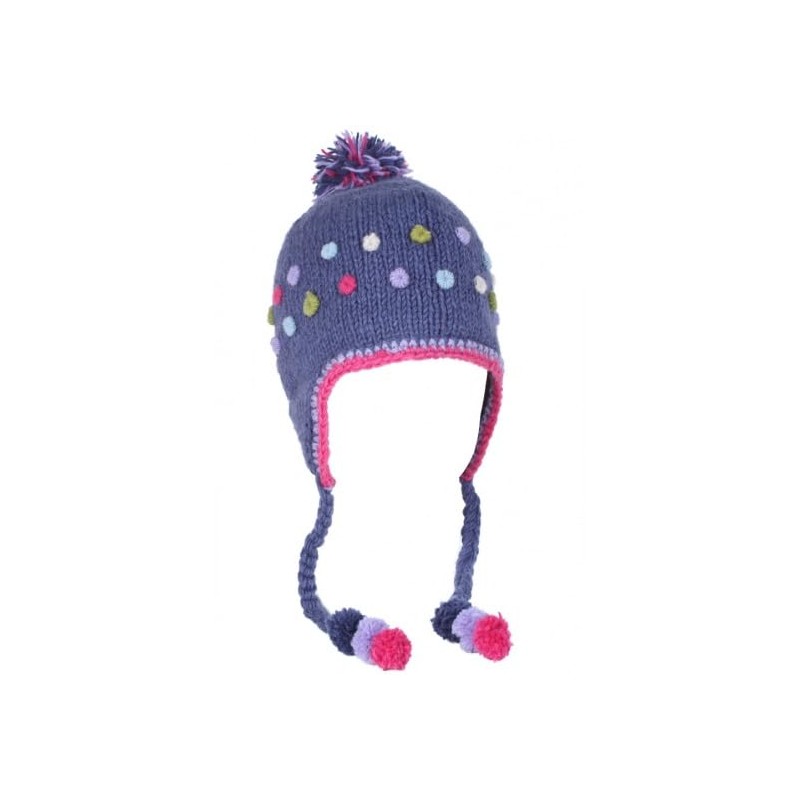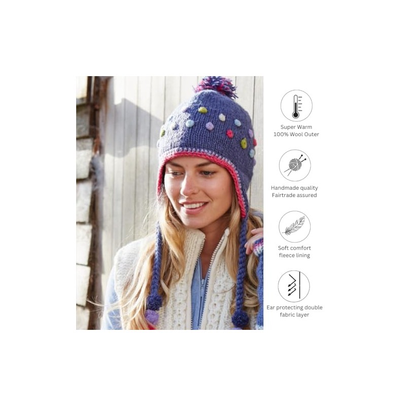 Pachamama Women Wool Beanie Bobble Hat Ear Flaps Fleece Lined Handknitted Textured Dots Denim Multicoloured One-Size Handmade Extra Warm Fair Trade